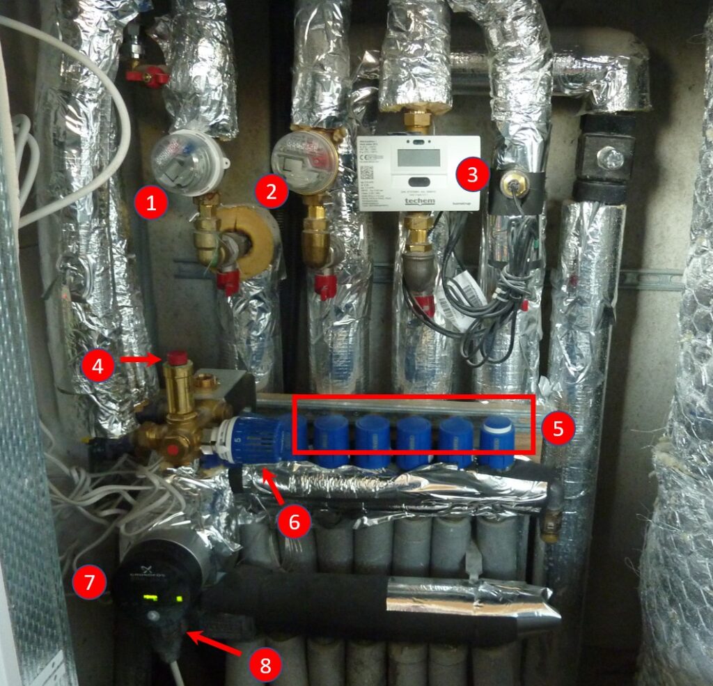 Ideelt bør den stå på CIRKA 60-75 % af max. ( Af ukendte årsager kan nogle ventiler drejes til “4”, mens andre kan drejes højere op ) - Pumpen, der sendes det varme vand rundt i de enkelte kredse i lejligheden, hvis deres ventiler ( 5 ) er åbne.